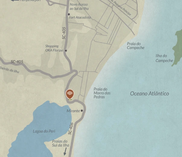 Localizado no Sul da Ilha, a poucos metros da Lagoa do Peri e do mar, o